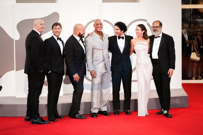 (R-L) Andrea Romeo, Emily Blunt, Benny Safdie, Dwayne Johnson, Mark Kerr, David Koplan and Hiram Garcia attending The Smashing Machine red carpet during the 82nd Venice International Film Festival on September 1, 2025 in Venice, Italy.(Photo by Lucia Sabatelli / Bestimage) EDITORIAL USE ONLY