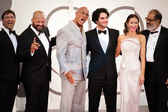 (R-L) Andrea Romeo, Emily Blunt, Benny Safdie, Dwayne Johnson, Mark Kerr, David Koplan and Hiram Garcia attending The Smashing Machine red carpet during the 82nd Venice International Film Festival on September 1, 2025 in Venice, Italy.(Photo by Lucia Sabatelli / Bestimage) EDITORIAL USE ONLY
