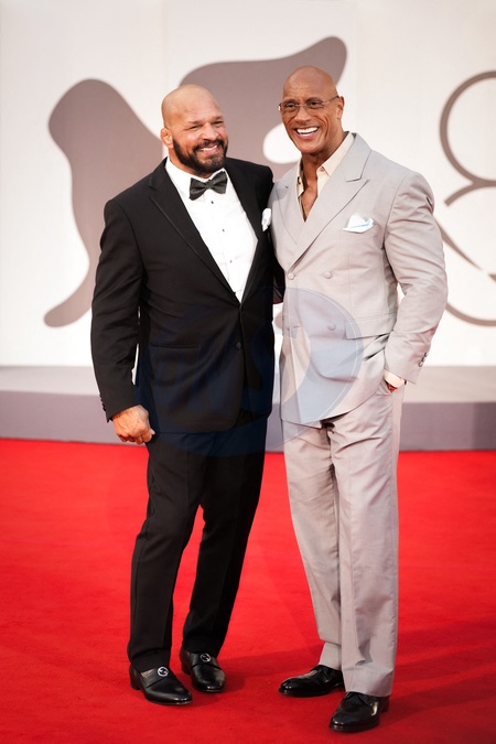 Dwayne Johnson and Mark Kerr attending The Smashing Machine red carpet during the 82nd Venice International Film Festival on September 1, 2025 in Venice, Italy.(Photo by Lucia Sabatelli / Bestimage) EDITORIAL USE ONLY