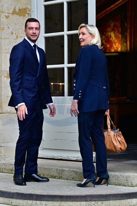 Jordan Bardella et Marine Le Pen après une réunion avec le Premier ministre dans le cadre de consultations politiques à l'Hôtel de Matignon à Paris