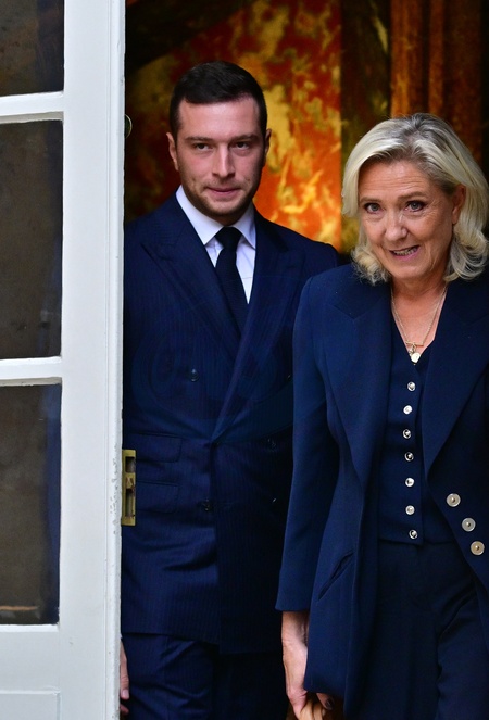 Jordan Bardella i Marine Le Pen po spotkaniu z premierem w ramach konsultacji politycznych w paryskim Hôtel de Matignon.