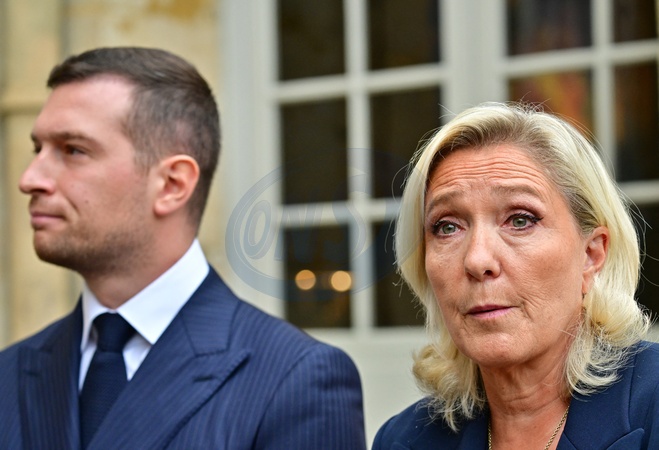 Jordan Bardella et Marine Le Pen après une réunion avec le Premier ministre dans le cadre de consultations politiques à l'Hôtel de Matignon à Paris