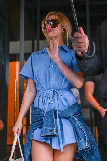 Exclusif - L'auteure-compositrice-interprète, actrice et influenceuse américaine Addison Rae, dans une tenue bleue Jaquemus associé à des bottes en daim rouge, sort de l'hôtel Costes pour se rendre à son concert au Zénith Paris – La Villette, à Paris, France, le 2 septembre 2025. © Yehiel Chekroune/Bestimage No Web pour la Belgique et la Suisse Exclusive - For Germany Call For Price - American singer-songwriter, actress and influencer Addison Rae, in a blue Jaquemus outfit paired with red suede boots, leaves the Costes Hotel on her way to her concert at Zenith Paris – La Villette, in Paris, France, on September 2, 2025.