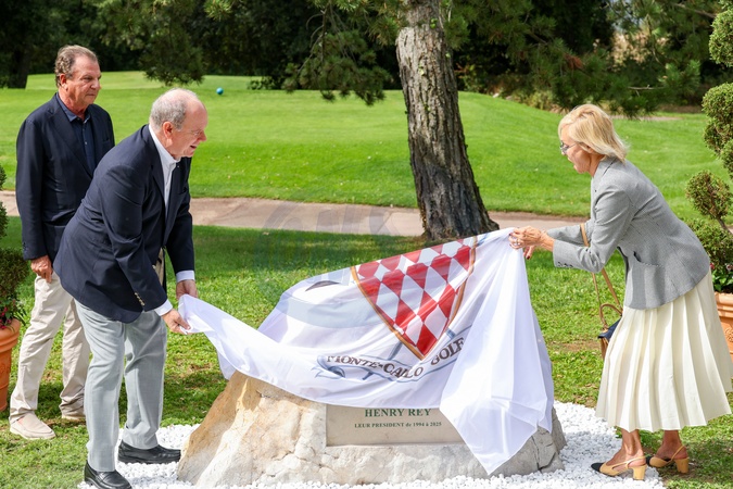 Exclusif - No Tabloïds - Michel Dotta (nouveau président du Monte-Carlo Golf Club), le prince Albert II de Monaco et Sophie Rey (femme du défunt) lors de l'inauguration d'une pierre commémorative à Henry Rey (président du Monte-Carlo Golf Club de 1994 à 2025) au Monte-Carlo Golf Club de Monaco, ce mardi 2 septembre2025 à 11h30. © Claudia Albuquerque/Bestimage Exclusive - No Tabloïds - No Mail Online - Only for OK, Hello, Grazia in UK - Prince Albert II of Monaco at the inauguration of a commemorative stone for Henry Rey at the Monte-Carlo Golf Club in Monaco, this Tuesday, September 2, 2025 at 11:30 a.m. © Claudia Albuquerque/Bestimage