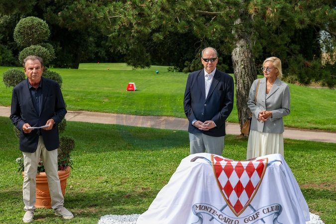 Exclusif - No Tabloïds - Michel Dotta (nouveau président du Monte-Carlo Golf Club), le prince Albert II de Monaco et Sophie Rey (femme du défunt) lors de l'inauguration d'une pierre commémorative à Henry Rey (président du Monte-Carlo Golf Club de 1994 à 2025) au Monte-Carlo Golf Club de Monaco, ce mardi 2 septembre2025 à 11h30. © Claudia Albuquerque/Bestimage Exclusive - No Tabloïds - No Mail Online - Only for OK, Hello, Grazia in UK - Prince Albert II of Monaco at the inauguration of a commemorative stone for Henry Rey at the Monte-Carlo Golf Club in Monaco, this Tuesday, September 2, 2025 at 11:30 a.m. © Claudia Albuquerque/Bestimage