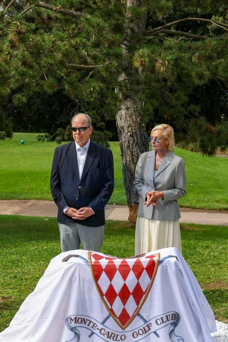 Exclusif - No Tabloïds - Le prince Albert II de Monaco et Sophie Rey (femme du défunt) lors de l'inauguration d'une pierre commémorative à Henry Rey (président du Monte-Carlo Golf Club de 1994 à 2025) au Monte-Carlo Golf Club de Monaco, ce mardi 2 septembre2025 à 11h30. © Claudia Albuquerque/Bestimage Exclusive - No Tabloïds - No Mail Online - Only for OK, Hello, Grazia in UK - Prince Albert II of Monaco at the inauguration of a commemorative stone for Henry Rey at the Monte-Carlo Golf Club in Monaco, this Tuesday, September 2, 2025 at 11:30 a.m. © Claudia Albuquerque/Bestimage