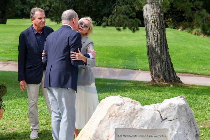 Exclusif - No Tabloïds - Michel Dotta (nouveau président du Monte-Carlo Golf Club), le prince Albert II de Monaco et Sophie Rey (femme du défunt) lors de l'inauguration d'une pierre commémorative à Henry Rey (président du Monte-Carlo Golf Club de 1994 à 2025) au Monte-Carlo Golf Club de Monaco, ce mardi 2 septembre2025 à 11h30. © Claudia Albuquerque/Bestimage Exclusive - No Tabloïds - No Mail Online - Only for OK, Hello, Grazia in UK - Prince Albert II of Monaco at the inauguration of a commemorative stone for Henry Rey at the Monte-Carlo Golf Club in Monaco, this Tuesday, September 2, 2025 at 11:30 a.m. © Claudia Albuquerque/Bestimage