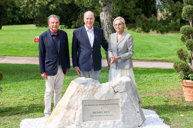 Exclusif - No Tabloïds - Michel Dotta (nouveau président du Monte-Carlo Golf Club), le prince Albert II de Monaco et Sophie Rey (femme du défunt) lors de l'inauguration d'une pierre commémorative à Henry Rey (président du Monte-Carlo Golf Club de 1994 à 2025) au Monte-Carlo Golf Club de Monaco, ce mardi 2 septembre2025 à 11h30. © Claudia Albuquerque/Bestimage Exclusive - No Tabloïds - No Mail Online - Only for OK, Hello, Grazia in UK - Prince Albert II of Monaco at the inauguration of a commemorative stone for Henry Rey at the Monte-Carlo Golf Club in Monaco, this Tuesday, September 2, 2025 at 11:30 a.m. © Claudia Albuquerque/Bestimage