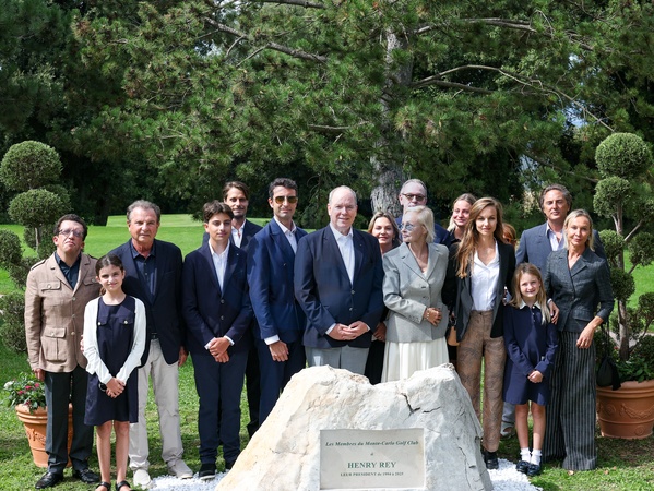 Exclusif - No Tabloïds - Michel Dotta (nouveau président du Monte-Carlo Golf Club), le prince Albert II de Monaco, Sophie Rey (femme du défunt) et guests lors de l'inauguration d'une pierre commémorative à Henry Rey (président du Monte-Carlo Golf Club de 1994 à 2025) au Monte-Carlo Golf Club de Monaco, ce mardi 2 septembre2025 à 11h30. © Claudia Albuquerque/Bestimage Exclusive - No Tabloïds - No Mail Online - Only for OK, Hello, Grazia in UK - Prince Albert II of Monaco at the inauguration of a commemorative stone for Henry Rey at the Monte-Carlo Golf Club in Monaco, this Tuesday, September 2, 2025 at 11:30 a.m. © Claudia Albuquerque/Bestimage