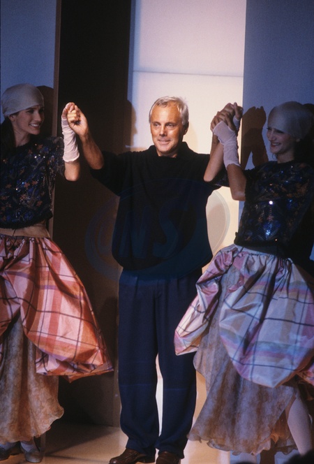 Fashion designer Giorgio Armani during a fashion show, Milan 1987 / Lo stilista Giorgio Armani durante una sfilata, Milano 1987 - *** MINIMUM FEE ?300 ***, Credit:Luciano Viti / Avalon