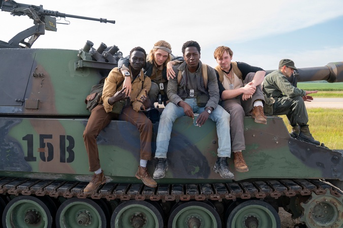 Tut Nyuot as Baker, Charlie Plummer as Barkovitch, David Jonsson as McVries, and Cooper Hoffman as Garraty in "The Long Walk" (2025)., Credit:Murray Close/Lionsgate / Avalon