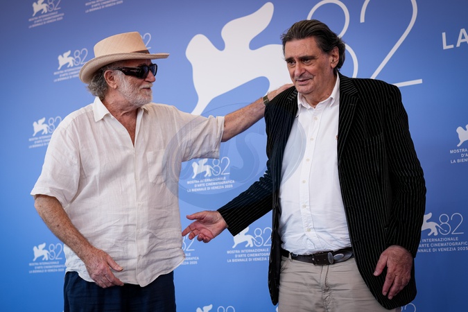 Francesco De Gregori and Stefano Pistolini attend the "Francesco De Gregori Nevergreen” photocall during the 82nd Venice International Film Festival in Venice, Italy on 05 September 2025., Credit:Stefano Costantino TTL / Avalon