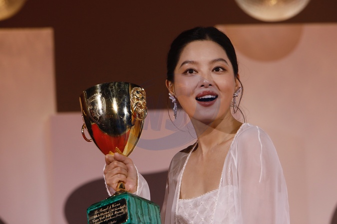 Xin Zhilei after being awarded the Coppa Volpi for Best Actress for "The Sun Rises on Us All" . Venice, Italy 06 September 2025, Credit:Mirco Toniolo / Avalon