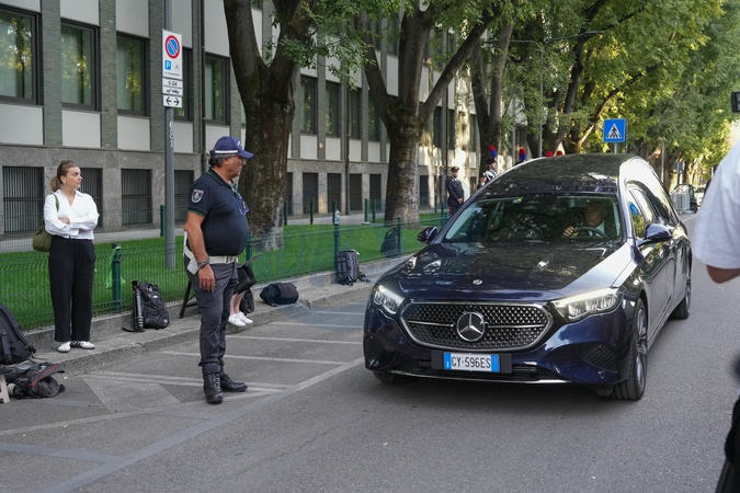 A hearse enters the Armani Theatre where late Italian fashion designer Giorgio Armani lay-in state for two days, on September 7, 2025. (Photo by Lucia Sabatelli / Bestimage) EDITORIAL USE ONLY