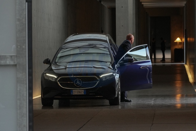 A hearse enters the Armani Theatre where late Italian fashion designer Giorgio Armani lay-in state for two days, on September 7, 2025. (Photo by Lucia Sabatelli / Bestimage) EDITORIAL USE ONLY