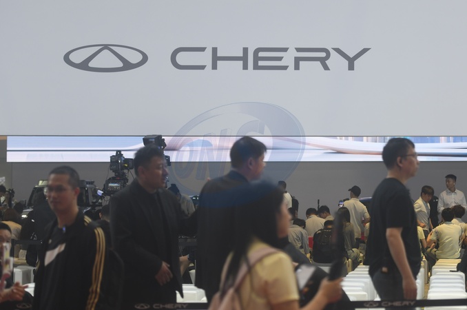 A brand logo of Chery Automobile during the Shanghai Auto Show in Shanghai, China Wednesday, April 23, 2025. Chery, China's second-largest carmaker by volume, passed its listing hearing on the Hong Kong Stock Exchange (HKEX) on Sept. 7., Credit:LONG WEI / Avalon