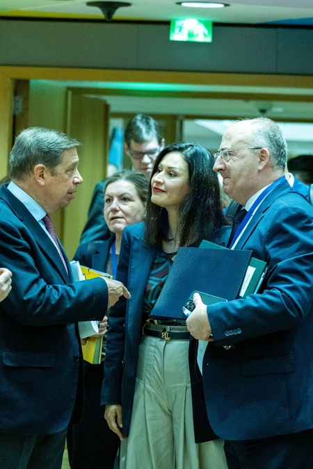 Luis PLANAS PUCHADES and Jose Manuel FERNANDES and Maria PANAYIOTOU at the meeting of the Minister of Agriculture and Fisheries of the European Union in the European Council in Brussels in Belgium on February 24 2025. Ministers discuss "rural proofing” for policies tailored to the needs of people living and working in rural areas as well as the market situation following the invasion of Ukraine.Luis PLANAS PUCHADES et PANAYIOTOU et Jose Manuel FERNANDES a la reunion de ministre de l agriculture et de la peche de l Union Europeenne au Conseil Europeen a Bruxelles en Belgique le 24 Fevrier 2025. Les ministres discutent de la « rural proofing » pour des politiques adaptees aux besoins des populations vivant et travaillant en milieu rural et egalement de la situation du marche apres l invasion de l Ukraine., Credit:Martin Bertrand / Avalon
