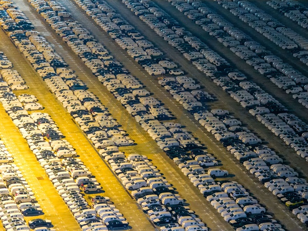 Aerial view of new cars waiting for shipment to overseas markets in a port in Nanjing in east China's Jiangsu province Sunday, Sept. 07, 2025., Credit:stringer / Avalon