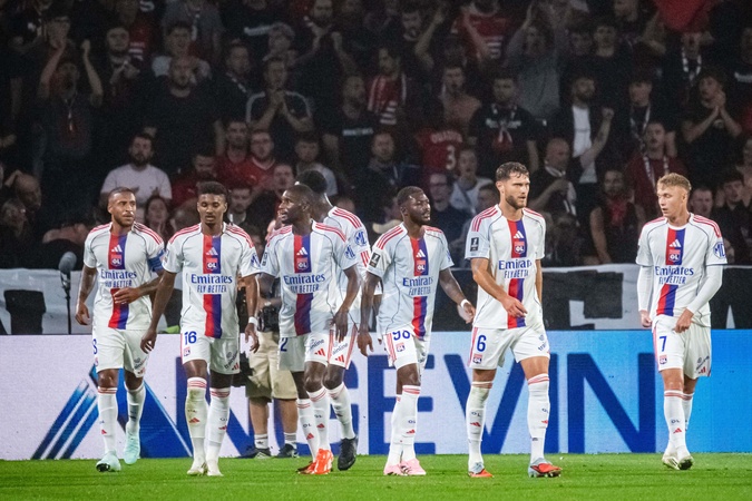 Joie des joueurs de l'OL aprés le but de Corentin Tolisso (OL). - Match de Ligue 1 McDonald's "Rennes - Lyon (3-1)" au Roazhon Park, le 14 septembre 2025. McDonald's Ligue 1 match "Rennes - Lyon (3-1)" at Roazhon Park, September 14, 2025.