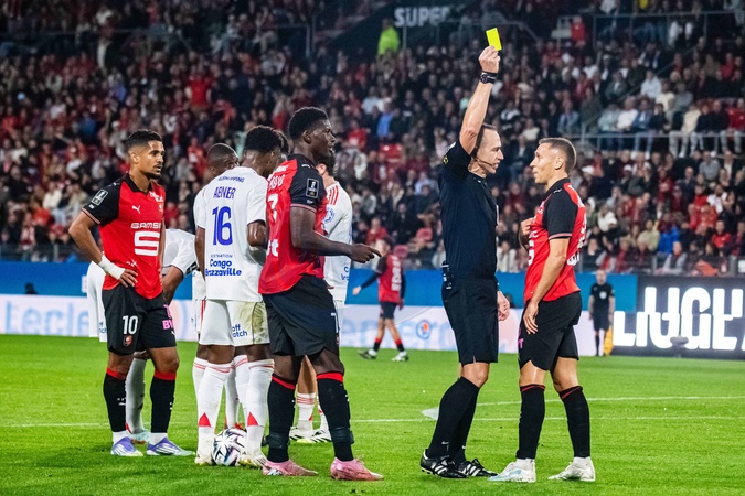 Ruddy Buquet (Arbitre central) Przemyslaw Frankowski (Stade Rennais) - Match de Ligue 1 McDonald's "Rennes - Lyon (3-1)" au Roazhon Park, le 14 septembre 2025. McDonald's Ligue 1 match "Rennes - Lyon (3-1)" at Roazhon Park, September 14, 2025.