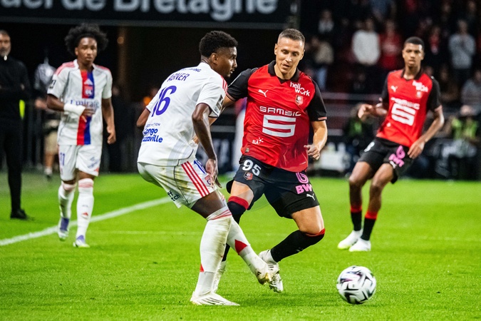 Przemyslaw Frankowski (Stade Rennais) Abner (OL) - Match de Ligue 1 McDonald's "Rennes - Lyon (3-1)" au Roazhon Park, le 14 septembre 2025. McDonald's Ligue 1 match "Rennes - Lyon (3-1)" at Roazhon Park, September 14, 2025.