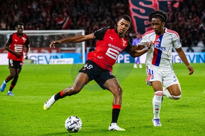 Abdelhamid Ait Boudlal (Stade Rennais) Malick Fofana (OL) - Match de Ligue 1 McDonald's "Rennes - Lyon (3-1)" au Roazhon Park, le 14 septembre 2025. McDonald's Ligue 1 match "Rennes - Lyon (3-1)" at Roazhon Park, September 14, 2025.