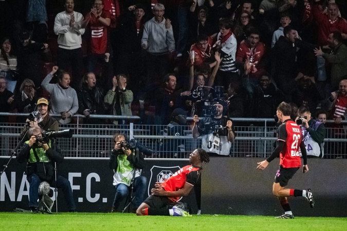 Joie des joueurs du Stade Rennais aprés le but contre son camps de Remy Descamps (OL) - Match de Ligue 1 McDonald's "Rennes - Lyon (3-1)" au Roazhon Park, le 14 septembre 2025. McDonald's Ligue 1 match "Rennes - Lyon (3-1)" at Roazhon Park, September 14, 2025.