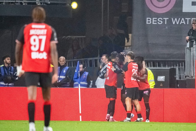 Joie des joueurs du Stade Rennais aprés le but de Remy Mohamed Kader Meite (Stade Rennais) - Match de Ligue 1 McDonald's "Rennes - Lyon (3-1)" au Roazhon Park, le 14 septembre 2025. McDonald's Ligue 1 match "Rennes - Lyon (3-1)" at Roazhon Park, September 14, 2025.