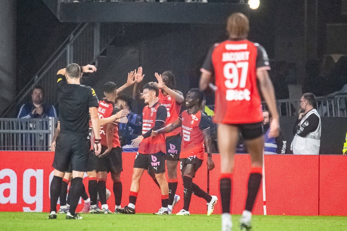 Joie des joueurs du Stade Rennais aprés le but de Remy Mohamed Kader Meite (Stade Rennais) - Match de Ligue 1 McDonald's "Rennes - Lyon (3-1)" au Roazhon Park, le 14 septembre 2025. McDonald's Ligue 1 match "Rennes - Lyon (3-1)" at Roazhon Park, September 14, 2025.