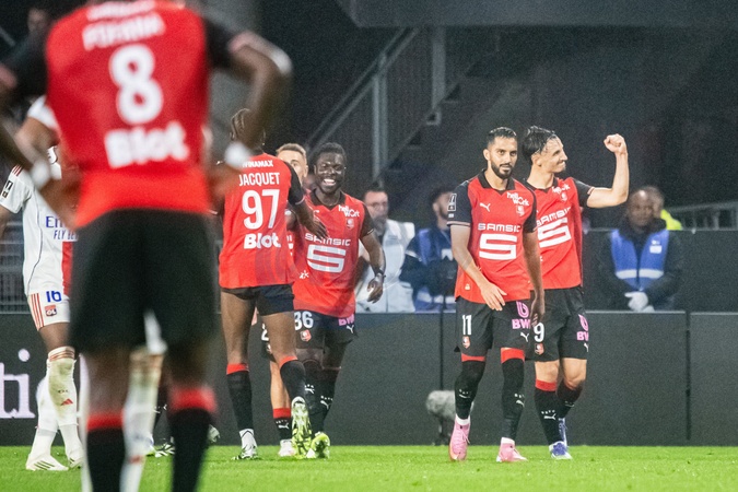 Joie des joueurs du Stade Rennais aprés le but de Remy Mohamed Kader Meite (Stade Rennais) - Match de Ligue 1 McDonald's "Rennes - Lyon (3-1)" au Roazhon Park, le 14 septembre 2025. McDonald's Ligue 1 match "Rennes - Lyon (3-1)" at Roazhon Park, September 14, 2025.