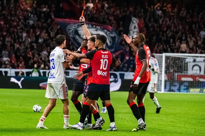 Expulsion de Tyler Morton (OL) - Match de Ligue 1 McDonald's "Rennes - Lyon (3-1)" au Roazhon Park, le 14 septembre 2025. McDonald's Ligue 1 match "Rennes - Lyon (3-1)" at Roazhon Park, September 14, 2025.