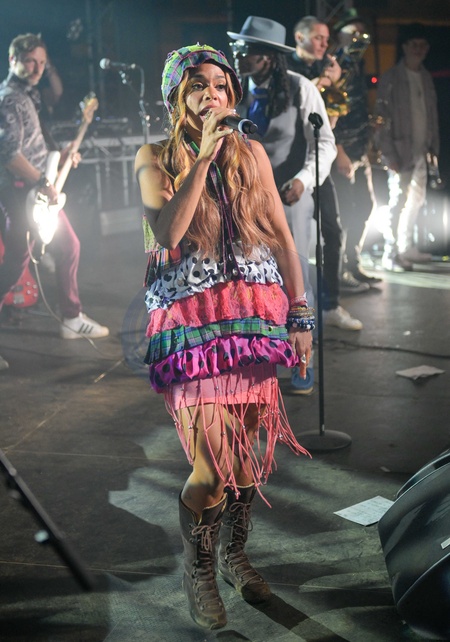 Kaya Fyah joins Dub Pistols onstage at Mucky Weekender 2025 Friday Vicarage Farm, Woodman Cott, Winchester, Credit:Jules Annan / Avalon