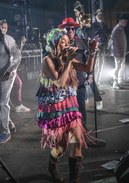 Kaya Fyah joins Dub Pistols onstage at Mucky Weekender 2025 Friday Vicarage Farm, Woodman Cott, Winchester, Credit:Jules Annan / Avalon