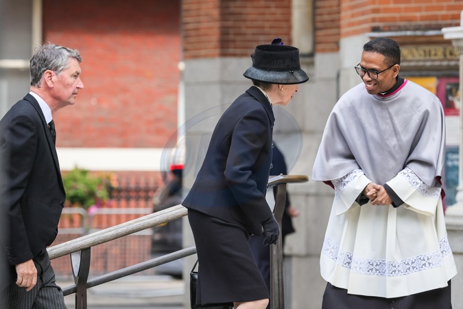 London, UK, 16th Sep 2025. The Princess Royal, Anne and Admiral Laurence. Mourners, including members of the Royal Family, are seen arriving at Westminster Cathedral for a requiem mass, a Catholic funeral service held for the Duchess of Kent, who passed away on 4 Sep., Credit:Imageplotter / Avalon