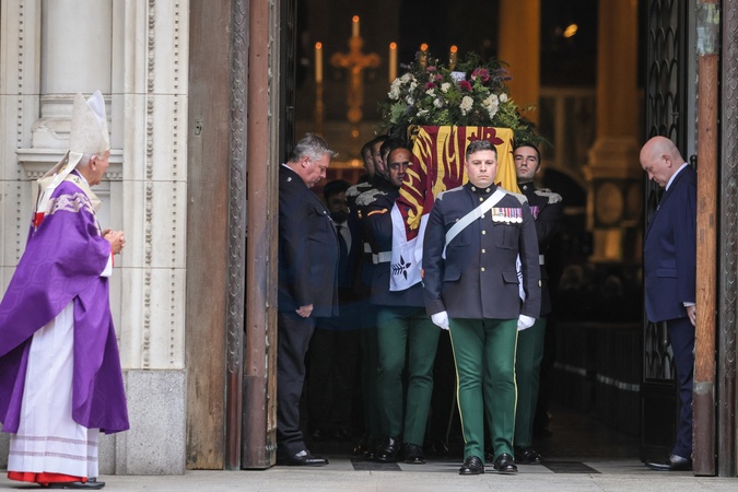 London, UK, 16th Sep 2025. The coffin is carried to the hearse. Mourners, including members of the Royal Family, are seen paying their respects as the coffin is carried out and into the hears, then departing from Westminster Cathedral after the a requiem mass, a Catholic funeral service held for the Duchess of Kent, who passed away on 4 Sep., Credit:Imageplotter / Avalon