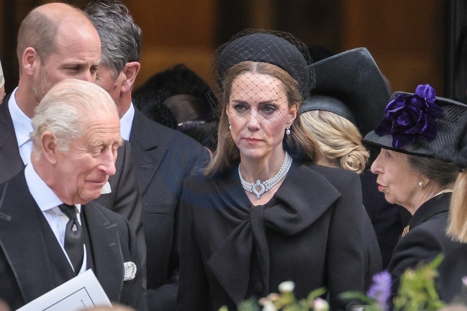 London, UK, 16th Sep 2025. HRH King Charles III, The Prince and Princess of Wales, Princess Anne and other senior members of the Royal Family. The coffin is carried to the hearse. Mourners, including members of the Royal Family, are seen paying their respects as the coffin is carried out and into the hears, then departing from Westminster Cathedral after the a requiem mass, a Catholic funeral service held for the Duchess of Kent, who passed away on 4 Sep., Credit:Imageplotter / Avalon