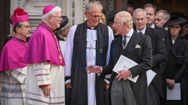 London, UK, 16th Sep 2025. King Charles chats to clergy. HRH King Charles III, The Prince and Princess of Wales Prince William and Princess Catherine, Anne the Princess Royal, Prince Andrew The Duke and Duchess of York, Prince Michael of Kent and other senior members of the Royal Family all pay their last respects as the coffin is carried to the hearse. They then depart from Westminster Cathedral after the a requiem mass, a Catholic funeral service held for the Duchess of Kent, who passed away on 4 Sep., Credit:Imageplotter / Avalon