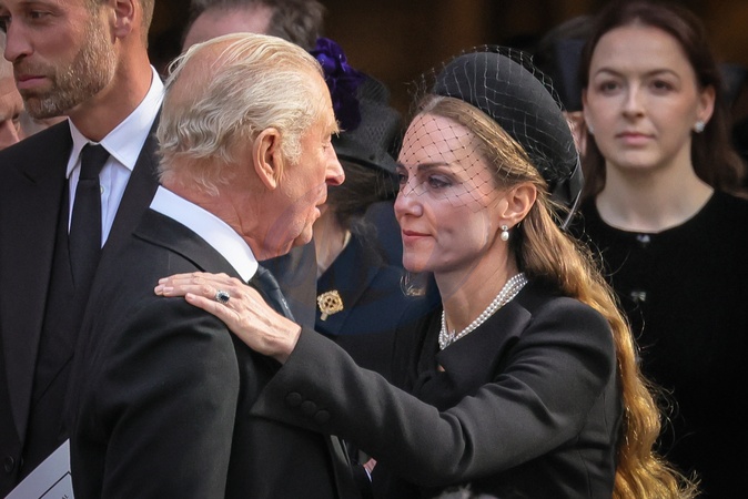 London, UK, 16th Sep 2025. Princess Catherine embraces and curtsies to King Charles. HRH King Charles III, The Prince and Princess of Wales Prince William and Princess Catherine, Anne the Princess Royal, Prince Andrew The Duke and Duchess of York, Prince Michael of Kent and other senior members of the Royal Family all pay their last respects as the coffin is carried to the hearse. They then depart from Westminster Cathedral after the a requiem mass, a Catholic funeral service held for the Duchess of Kent, who passed away on 4 Sep., Credit:Imageplotter / Avalon