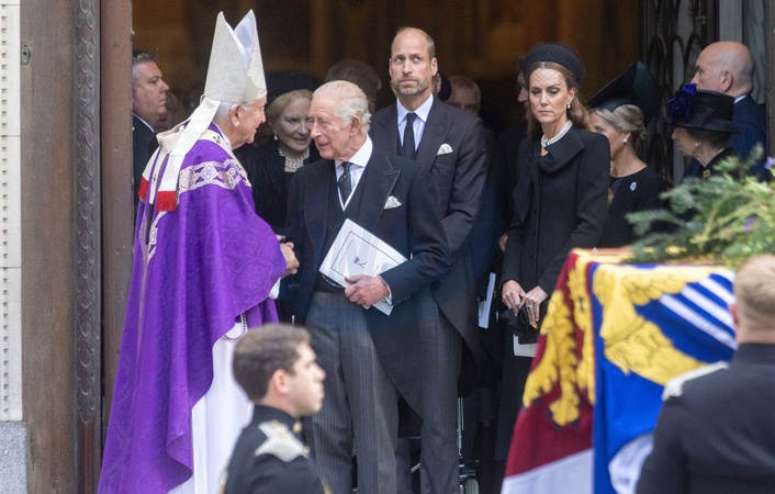 September 16, 2025, London, England, United Kingdom: King CHARLES III, Prince of Wales WILLIAM and Princess of Wales CATHERINE are seen outside Westminster Cathedral after Requiem Mass service for the Duchess of Kent. This is the first Catholic funeral service held for a member of the royal family in modern British history. Katharine, the wife of the late Queen's cousin the Duke of Kent, converted to Catholicism in 1994., Credit:ZUMAPRESS.com / Avalon