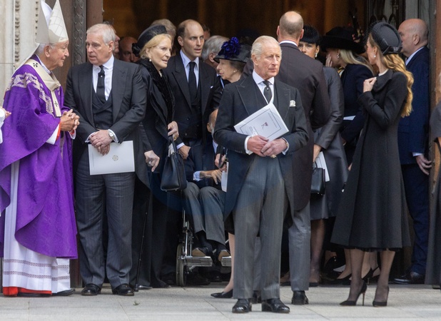 September 16, 2025, London, England, United Kingdom: King CHARLES III, Prince of Wales WILLIAM, Princess of Wales CATHERINE and Prince ANDREW are seen outside Westminster Cathedral after Requiem Mass service for the Duchess of Kent. This is the first Catholic funeral service held for a member of the royal family in modern British history. Katharine, the wife of the late Queen's cousin the Duke of Kent, converted to Catholicism in 1994., Credit:ZUMAPRESS.com / Avalon