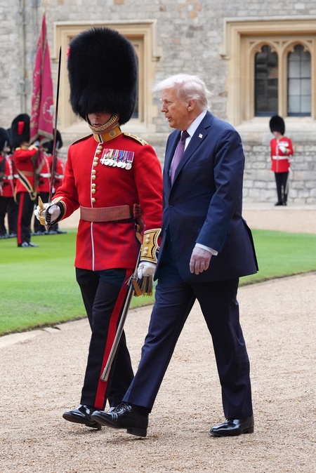 US President Donald Trump review the guard of honour during the ceremonial welcome at Windsor Castle, Berkshire, on day one of the president's second state visit to the UK. Picture date: Wednesday September 17, 2025., Credit:Jonathan Brady / Avalon