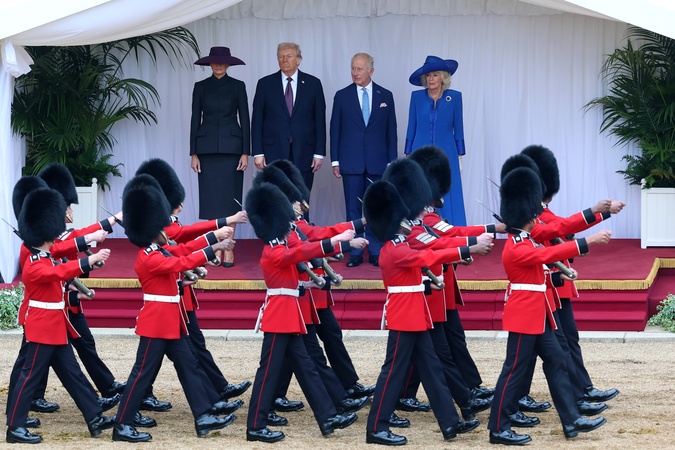 WINDSOR, ENGLAND - SEPTEMBER 17: First Lady Melania Trump, U.S. President Donald Trump, King Charles III and Queen Camilla inspect the troops during the State visit by the President of the United States of America at Windsor Castle on September 17, 2025 in Windsor, England., Credit:Chris Jackson / Avalon