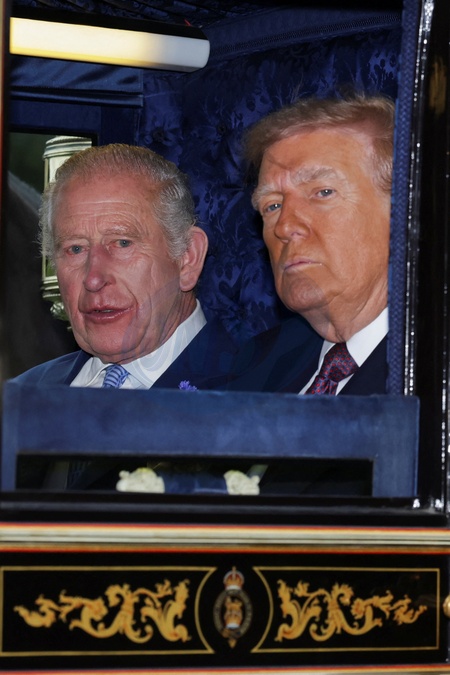 Britain's King Charles and U.S. President Donald Trump ride in a carriage during a procession through Windsor Castle, in Windsor, Britain, September 17, 2025., Credit:Toby Melville / Avalon