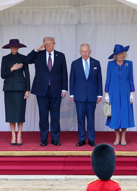 WINDSOR, ENGLAND - SEPTEMBER 17: First Lady Melania Trump, U.S. President Donald Trump, King Charles III and Queen Camilla inspect the troops during the State visit by the President of the United States of America at Windsor Castle on September 17, 2025 in Windsor, England., Credit:Chris Jackson / Avalon