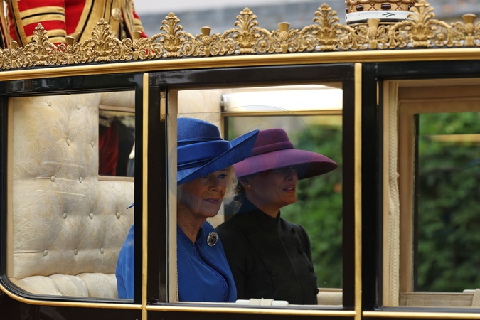 Britain's Queen Camilla (L) and US First Lady Melania Trump (R) travel in the The Scottish State Coach during a horse-drawn procession towards Windsor Castle, after landing in the grounds of Windsor Castle, in Windsor, on September 17, 2025, during a second State Visit. US President Donald Trump arrived in Britain for an unprecedented second State Visit, with the UK government rolling out a royal red carpet welcome to win over the mercurial leader., Credit:ADRIAN DENNIS / Avalon