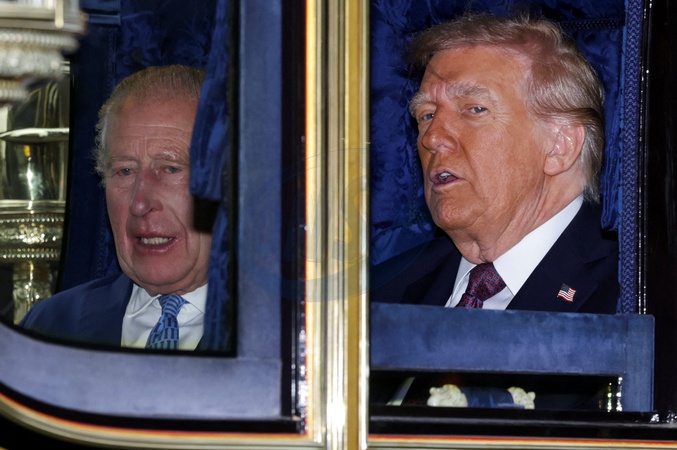 Britain's King Charles and U.S. President Donald Trump ride in a carriage during a procession through Windsor Castle, in Windsor, Britain, September 17, 2025., Credit:Toby Melville / Avalon