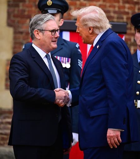Prime Minister of the United Kingdom Sir Keir Starmer greets President of the United States Donald Trump as he arrives at ChequersUS President Donald Trump state visit to the UK, Arrival, Day 3, Chequers - 18 Sep 2025, Credit:Victoria Jones/Shutterstock / Avalon