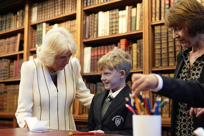 Queen Camilla speaks to school children drawing in their miniature books during a visit to the Royal Library in at Windsor Castle, Berkshire, on day two of the US President Donald Trump's second state visit to the UK. Picture date: Thursday September 18, 2025., Credit:Avalon.red / Avalon