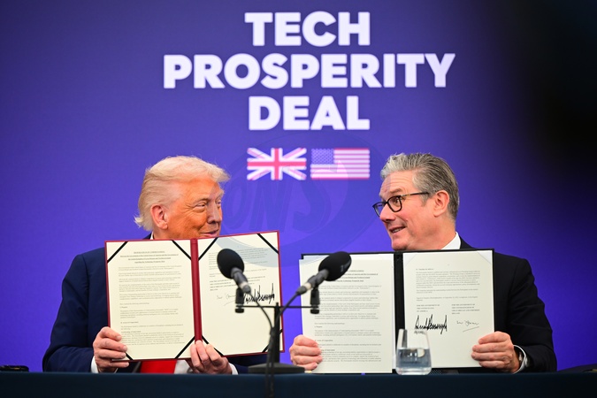 Prime Minister of the United Kingdom Sir Keir Starmer and President of the United States Donald Trump during a business event at Chequers. The meeting will involve the signing of the Tech Partnership agreement.US President Donald Trump state visit to the UK, Business Event, Day 3, Chequers - 18 Sep 2025, Credit:Victoria Jones/Shutterstock / Avalon