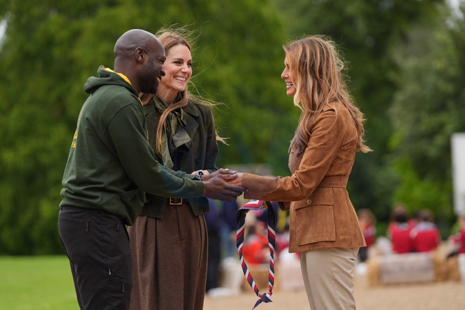 Chief Scout Dwayne Fields presents a Scout scarf to First Lady Melania Trump (right) after she and the Princess of Wales (centre) met members of the Scouts' Squirrels programme in Frogmore Gardens in Windsor, Berkshire, on day two of US President Donald Trump's second state visit to the UK. The princess and the US first lady joined 20 Squirrel Scouts taking part in nature activities on the Windsor Castle estate to earn their Go Wild badges. Picture date: Thursday September 18, 2025., Credit:Yui Mok / Avalon